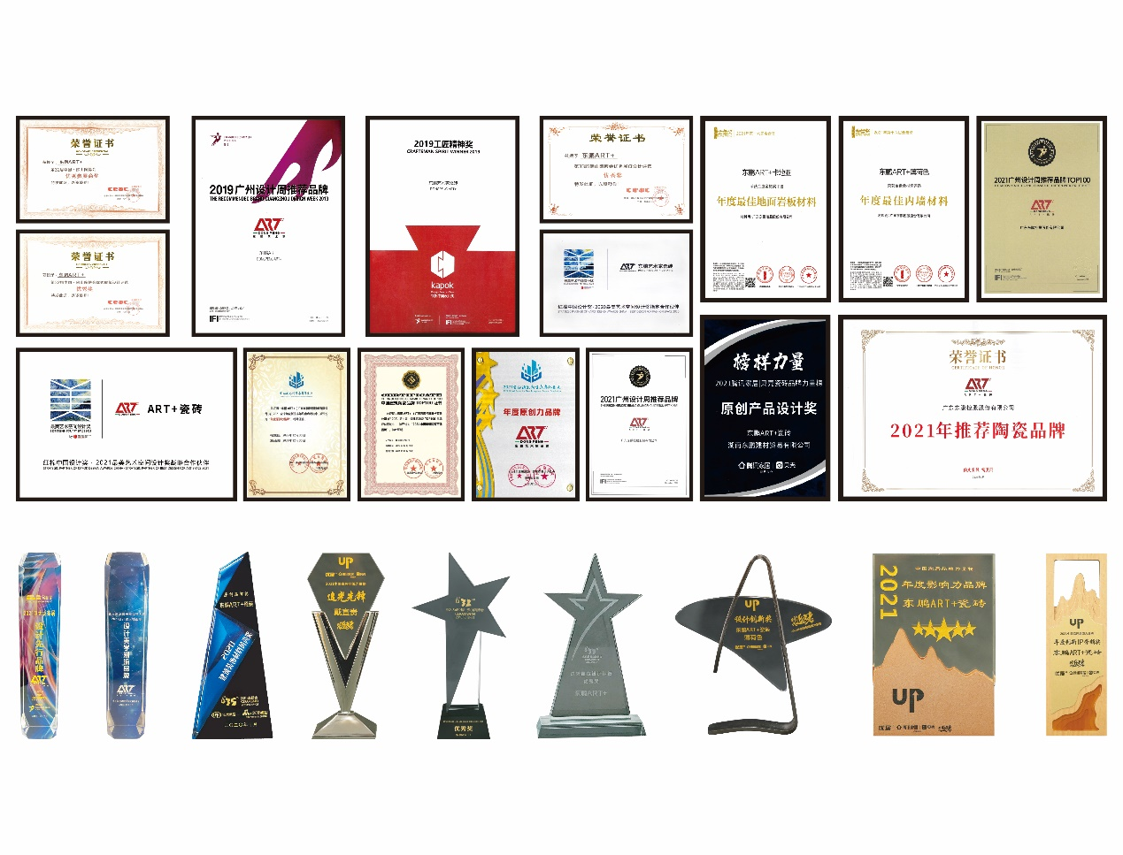 ART+瓷磚憑借原創設計能力、獨特創新工藝、領先綜合實力、卓越品牌影響力、高品質服務水平等優勢,榮獲“年度原創力品牌”“年度推薦陶瓷品牌”“原創產品設計獎”等多個行業獎項。
