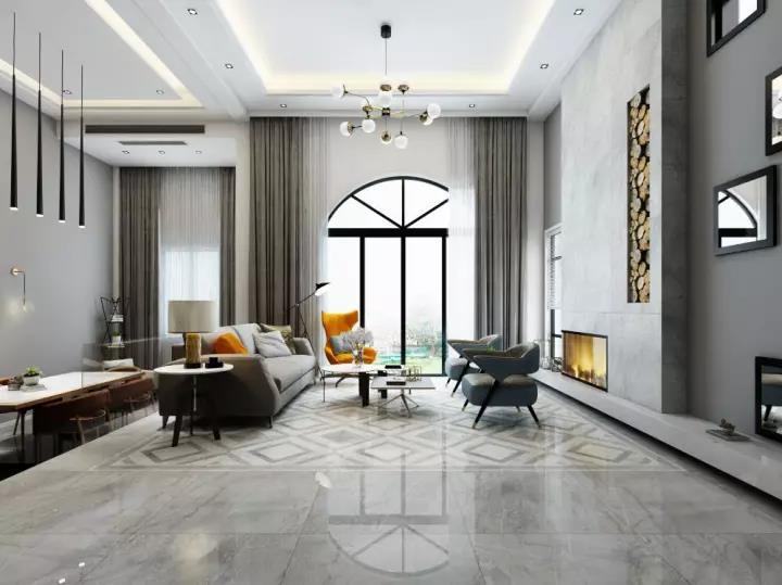 博斯科灰亮光面直鋪下地,配以菱形沙發地毯磚,豐富有層次感,搭配啞光面博斯科灰背景墻,營造現代風格時尚美,打造流行淺灰空間。