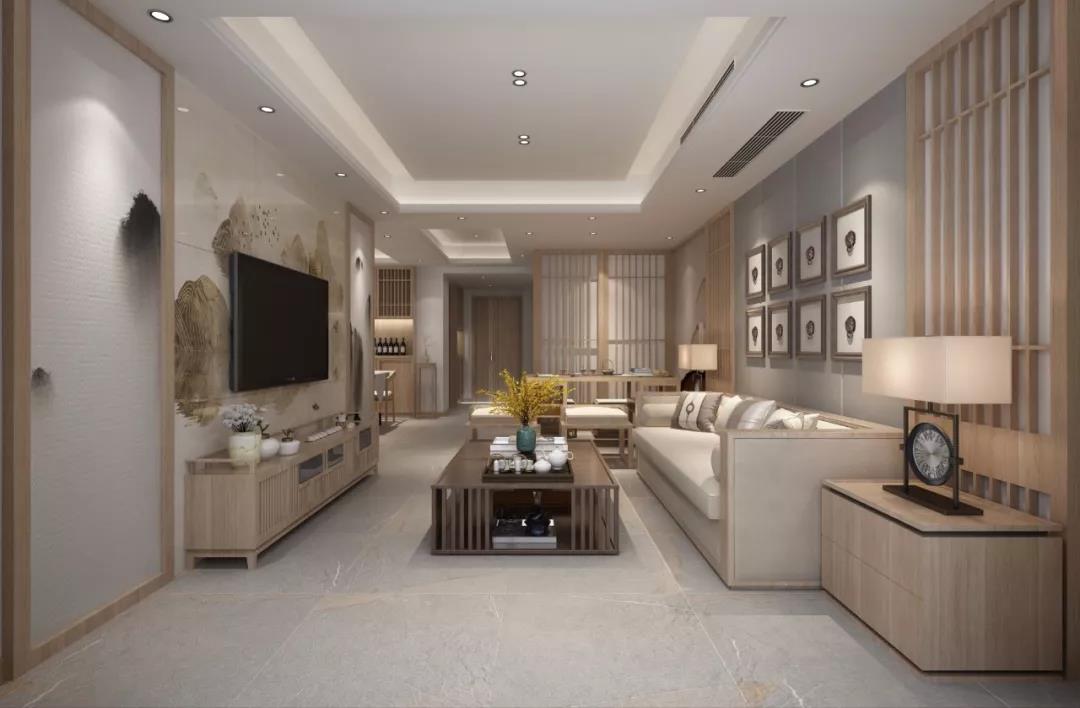 淺灰帝王石方正鋪貼在客廳,大理石紋路瓷磚和中國風元素家具,營造出新中式的格調。