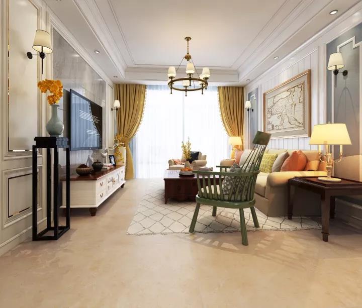 東鵬原石3.0舊米黃通鋪在客廳上,搭配布藝沙發、木制家具,營造溫馨的北歐風格。