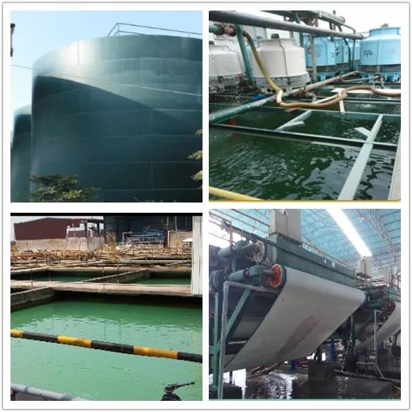 從左往右:【01廢水處理及循環利用系統、02大型廢水處理及循環利用系統、03經處理后的工業廢水、04污水處理廢渣壓濾機】