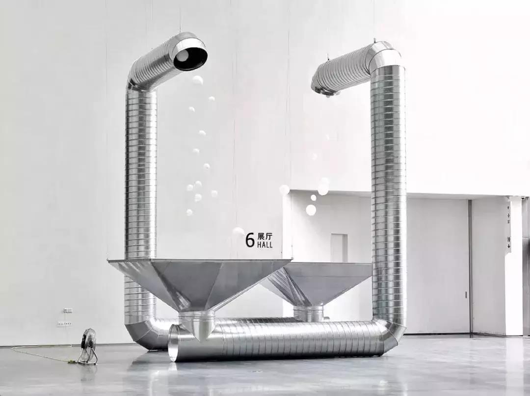 很多人慕名“白氣球”而來,藝術家查爾斯·佩逖倫(Charles Pe?tillon)這次一改往日風格,在展館的公共區域搭建了一個白氣球動態裝置。