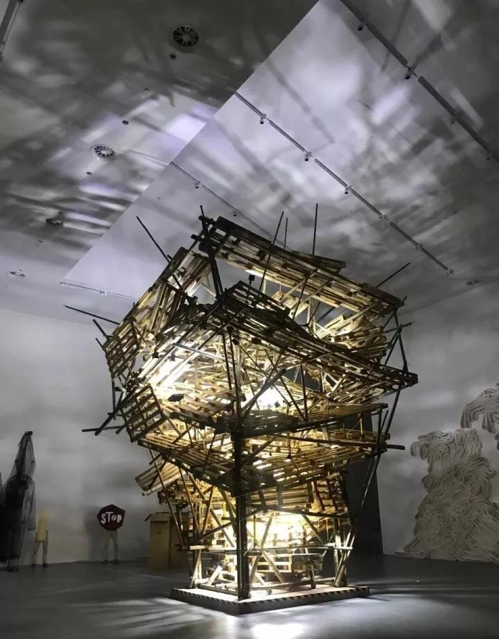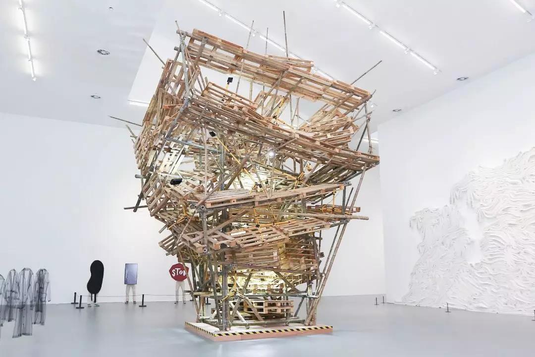 英國藝術家格拉漢姆·哈德森(Graham Hudson),他用廢棄的木板、竹子和燈管等材料在這里構筑了一個大型現場裝置,看起來就像一個面臨崩潰的建筑體。