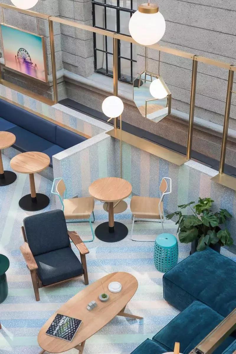 色彩斑斕的水磨石以豎條形狀鋪設。精細的水磨石,可以讓家具和分區豐富的空間顯得整體化。金屬線框與水磨石各自進行間隔和分區,各自精彩,相得益彰。