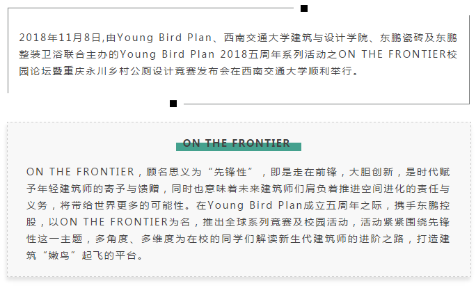 隨后,Young Bird Plan項(xiàng)目總監(jiān)范靜在現(xiàn)場(chǎng)發(fā)布ON THE FRONTIER 2018重慶永川鄉(xiāng)村國際設(shè)計(jì)競(jìng)賽命題,本次競(jìng)賽由Young Bird Plan、東鵬瓷磚及東鵬整裝衛(wèi)浴聯(lián)合主辦,重慶永川區(qū)政府及廣東省綠盟公益基金會(huì)參與支持。為積極響應(yīng)“廁所革命”的號(hào)召,競(jìng)賽主辦方希望以舉辦競(jìng)賽為契機(jī),集結(jié)全世界最具先鋒性的設(shè)計(jì)力量,突破常規(guī),打造最能體現(xiàn)重慶永川地理風(fēng)貌及人文情懷的公共設(shè)施。未來,Young Bird Plan與東鵬瓷磚及東鵬整裝衛(wèi)浴將持續(xù)聚焦新生代設(shè)計(jì)力量,致力于為中國的城市化發(fā)展和鄉(xiāng)村文明譜寫新章。