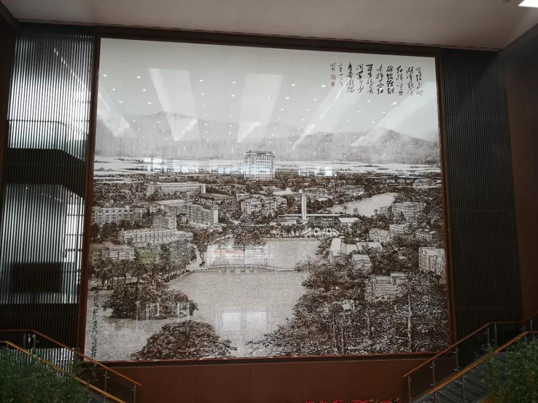 陶瓷壁畫《山水華園》使用了水墨山水的意象,遠遠望去,仿佛就在畫中,裊裊鐘聲縈繞耳畔,淺淺西湖碧波蕩漾。走近觀看,整幅壁畫氣勢磅礴、意蘊深遠,勵吾樓、人文館、建筑紅樓、西湖、拱橋、湖心亭等一批極具華南理工歷史文化意義的標志性建筑與景觀,細節分明賞心悅目。