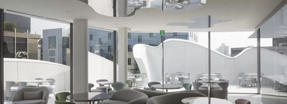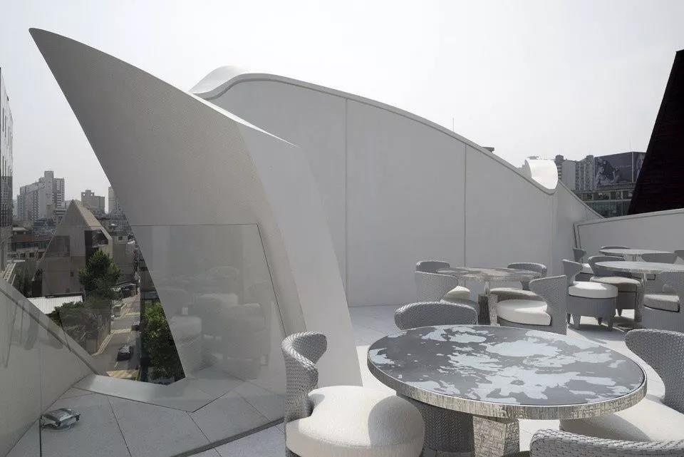 普林策獎獲得者Christian De Portzamparc設計的首爾Dior店,代表著一種精致的弧線外形,有著強烈的引人注目的視覺感,由樹脂和玻璃纖維構成的外墻從Dior的立體剪裁得到的靈感,代表著棉質印花布在Dior中的設計運用。