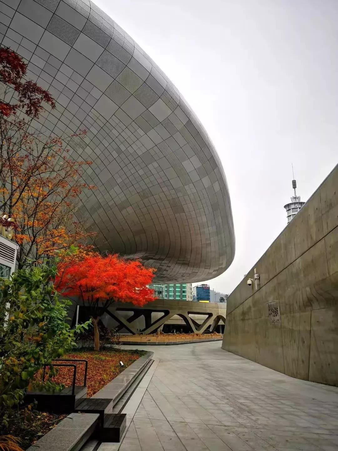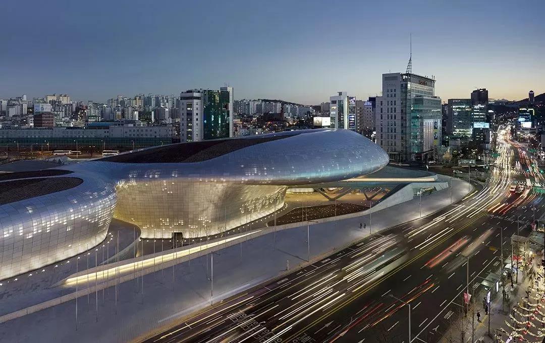 東大門設計廣場名稱縮寫DDP,也與其“夢想(Dream)、設計(Design)、享受(Play)”的理念相合。是由伊拉克籍女建筑師 Zaha Hadid 擔任總設計師,流線型的造型采用了三維立體的構思,是世界上最大的非標準建筑。