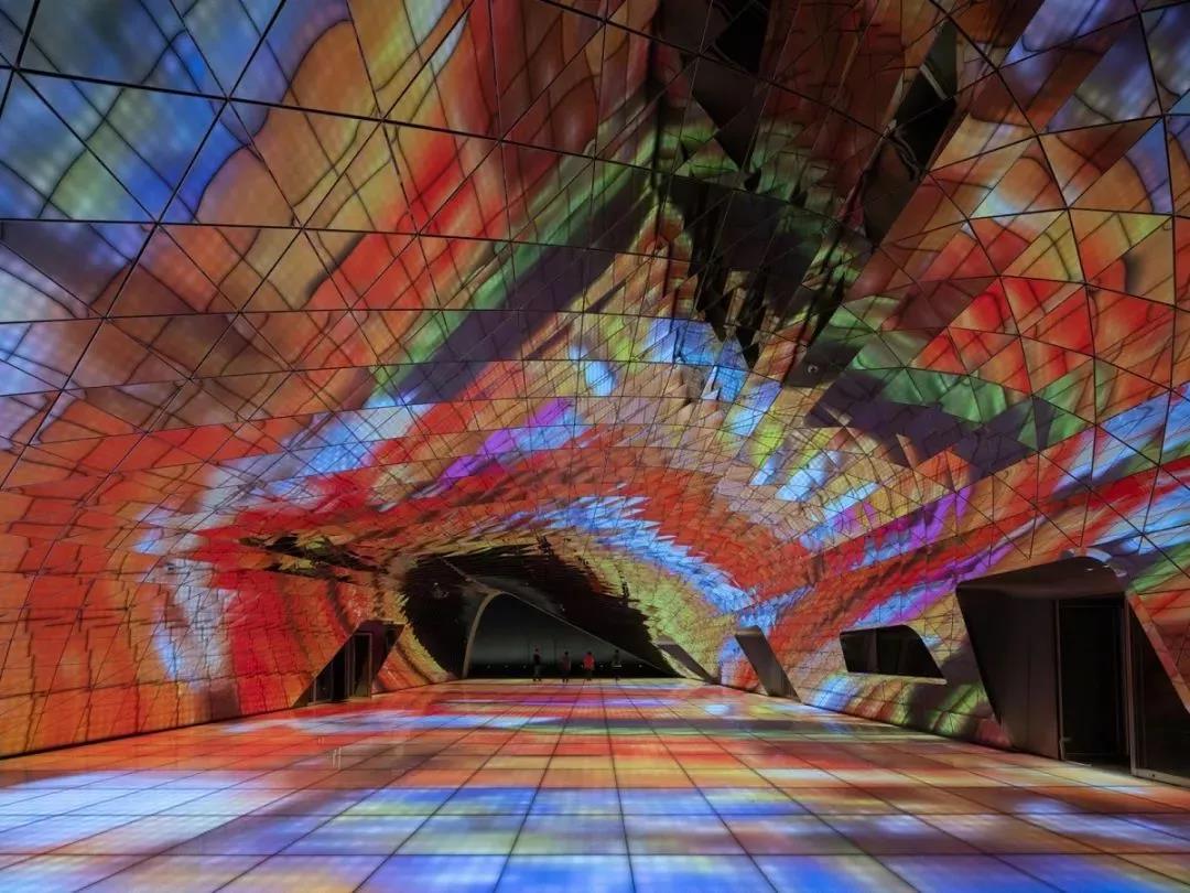 入口處,立面就像被掀起的劇院幕布,露出室內的鏡面天花板何玻璃多媒體地板,反射的燈光何戲劇化效果因此結合在一起。