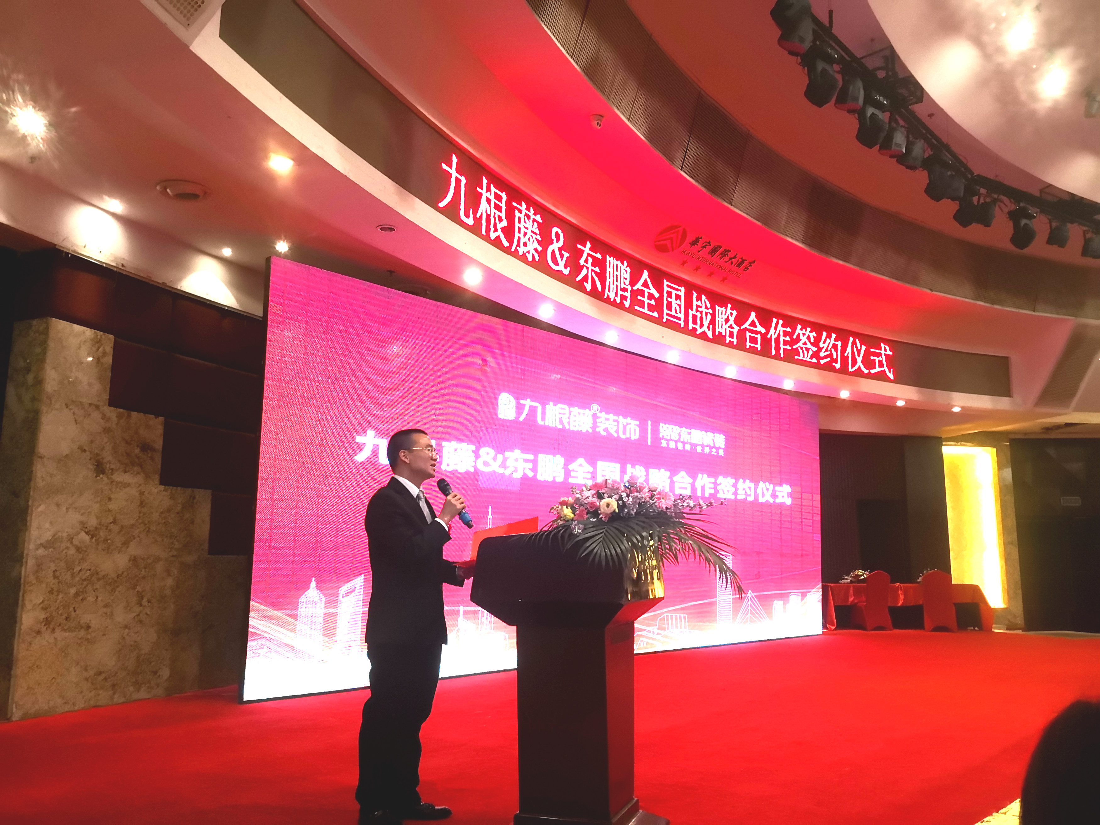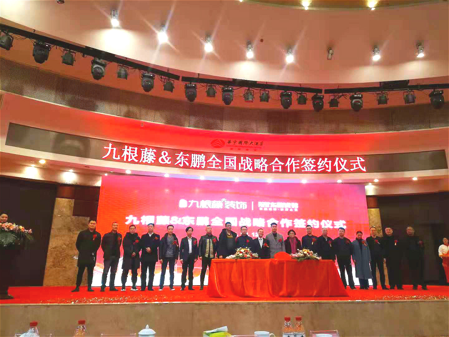 12月12日,湖南九根藤裝飾科技有限公司與廣東東鵬控股股份有限公司達成全國戰略合作。特邀市經信委黨委副書記、副主任葉仕良,市經信委產業政策科科長鄧曉星,中共岳塘區書院路街道書記殷濤,建設銀行高新支行行長郭艷梅,涓江集團董事長趙聲安,九根藤集團董事長譚峰,九根藤集團總經理史茂萱,九根藤集團執行總經理譚超,東鵬控股國內零售中心總經理鐘雄華,長沙浩博建材董事長張躍旗,東鵬瓷磚華中大區總經理張新明,湖南營銷部總監張華豪,以及長沙及湘潭媒體等嘉賓出席見證盛大的簽約儀式。