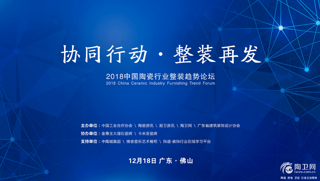 12月18日,中國工業合作協會、陶瓷資訊、廚衛資訊、陶衛網、廣東省建筑裝飾設計協會聯合主辦2018中國陶瓷行業整裝趨勢論壇以“協同行動·整裝再發”為主題探討陶瓷行業的整裝現狀與未來趨勢。