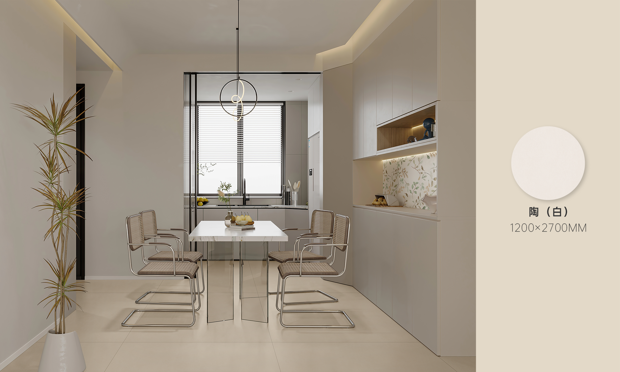 墻面選擇東鵬大地巖板系列陶(白),采用第三代數碼模具技術加8色通道,增加色彩表現力,還原陶土本色。為打造超自然光感的奶油風效果,1200×1200MM陶(白)搭配0.5mm密縫鋪貼技術,塑造“無縫”的舒適精致的空間,為居住帶來沉浸式的就餐體驗。流行的風格或許瞬息萬變,東鵬對美的追求卻始終如一。東鵬大地巖板系列汲取陶土色的靈感,兼具視覺與觸覺雙重提升,以柔和色彩與細膩質感詮釋奶油風家居美學,為現代消費者打造自然而舒適的家居環境。