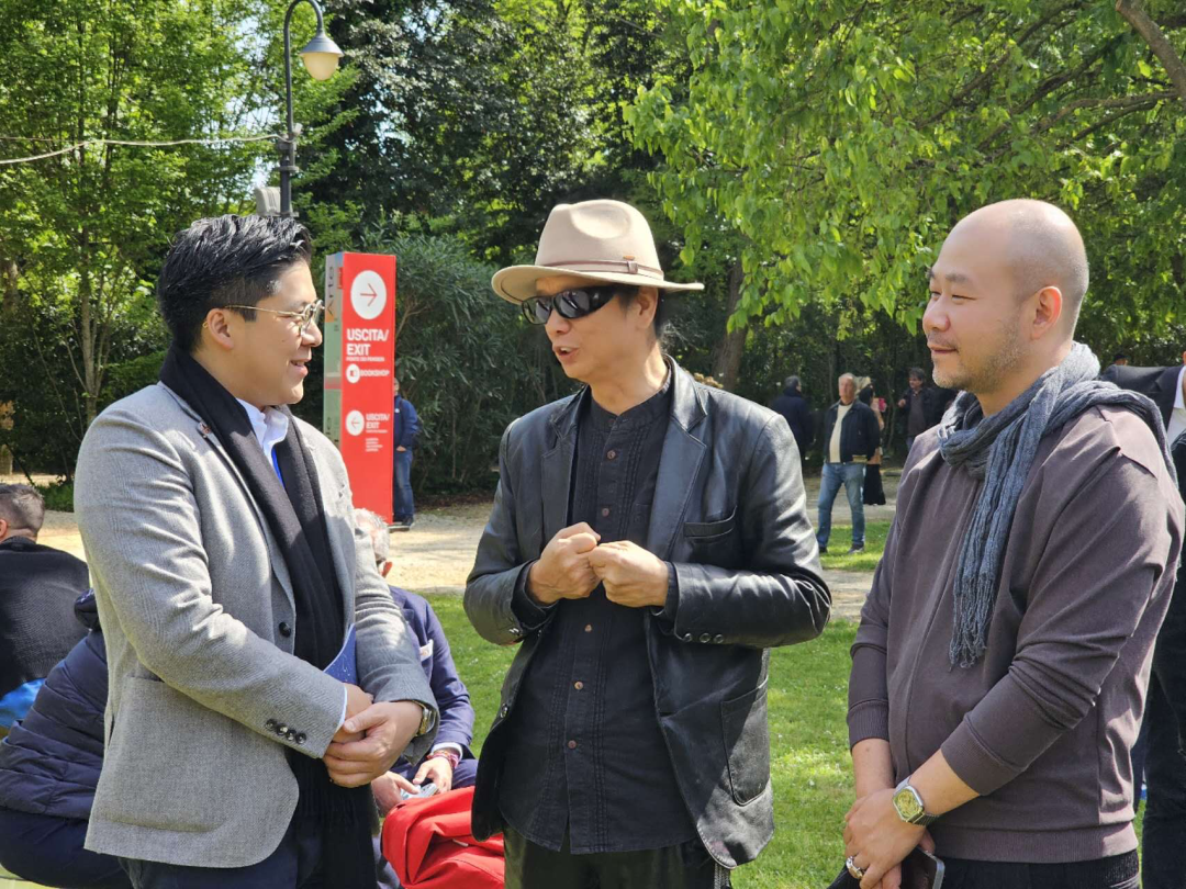 △ 香港藝發(fā)局主席霍啟剛(左)及特區(qū)政府文化體育及旅游局局長楊潤雄參觀中第60屆威尼斯雙年展國館,中國館策展人王小松(中)與姜俊(右)陪同講解