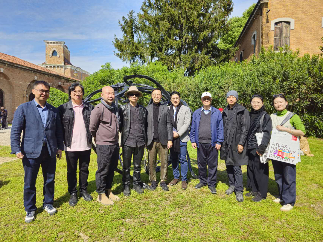 △ 香港藝發(fā)局主席霍啟剛及特區(qū)政府文化體育及旅游局局長楊潤雄參觀中第60屆威尼斯雙年展國館,與藝術(shù)家及策展團隊合影