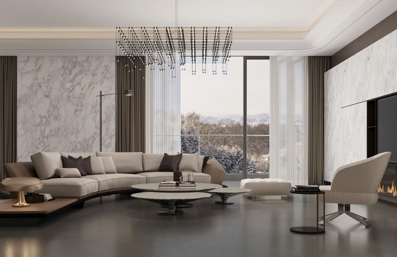 融合尖端科技與藝術審美,超自然光感技術與40組精細柔拋,賦予石材生命力與獨特視覺享受,打造25°柔光效果,光線以一種細膩而溫柔的方式流淌于石材紋理之間,營造出一種寧靜而高雅的空間氛圍。