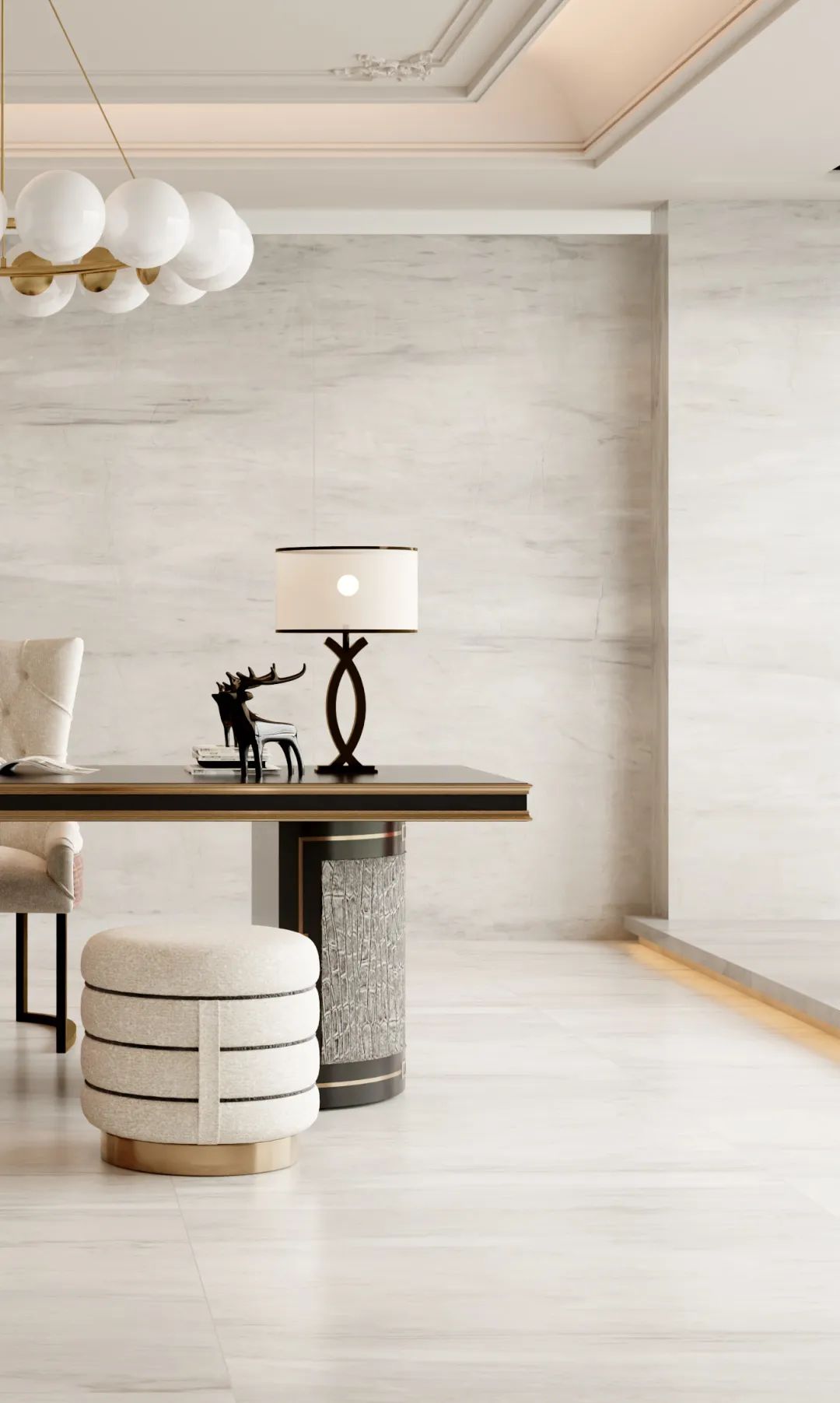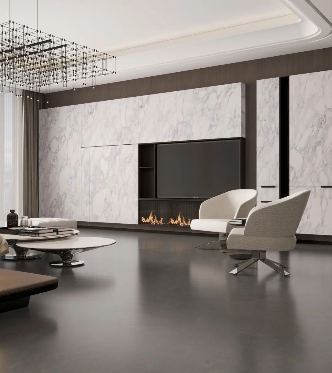 既是家庭感情交流與歡聚的中心舞臺,也是體現主人藝術審美的核心場所,客餐廳的重要性不言而喻,選用個性大氣的寶格麗白與奢石紋理作為墻體搭配,調配空間藝術氣息與尊貴感,連紋系統無限延伸視覺,讓整體空間一體,更顯高端。