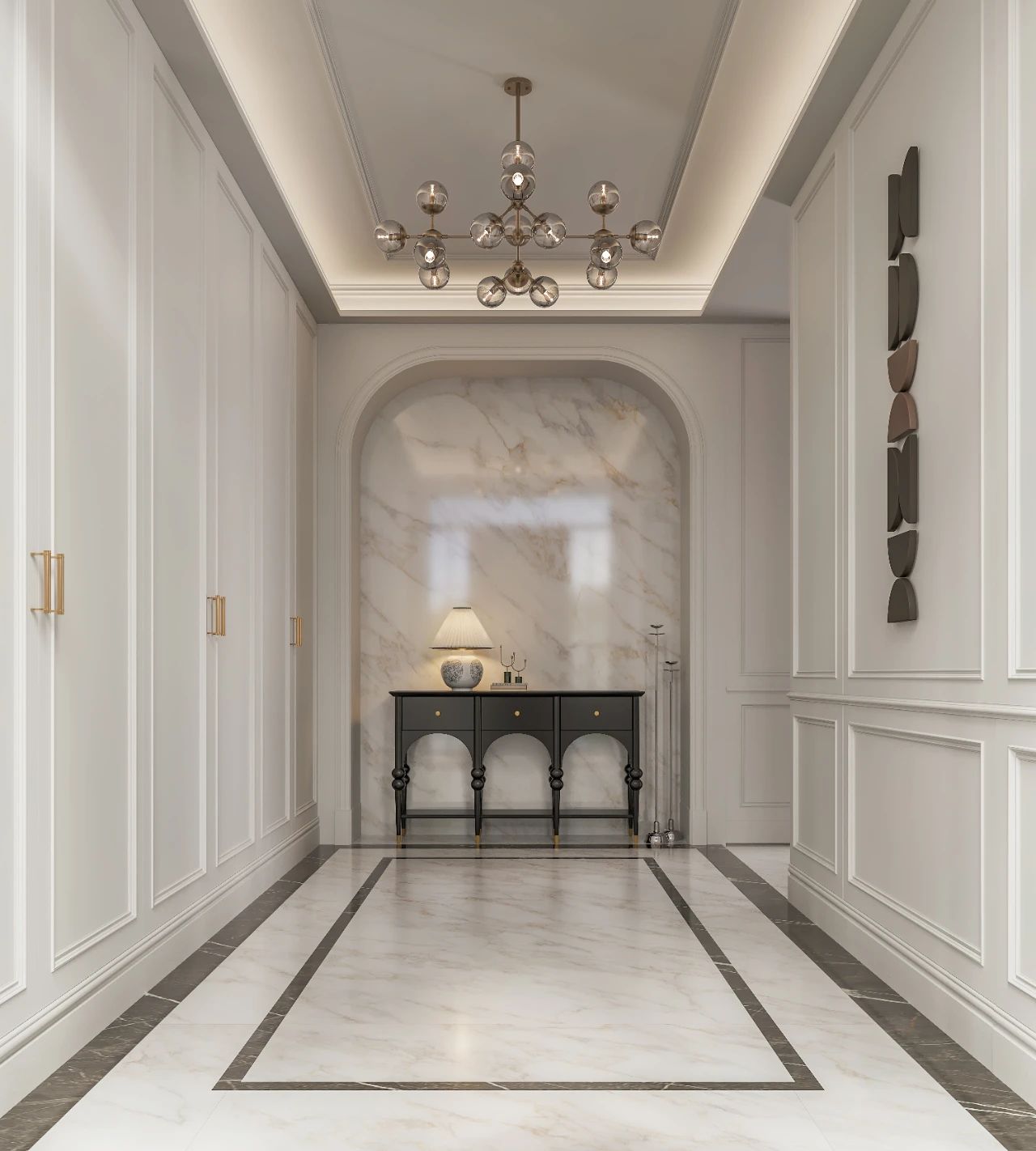 作為家里的第一道風景線,入戶玄關不僅是內外空間的過渡,更是主人品味的初印象。作為入戶區域,采光較弱,以迪奧金為主色,白色地面使玄關透亮,墻面局部暗色點綴,整體溫馨又不失格調。