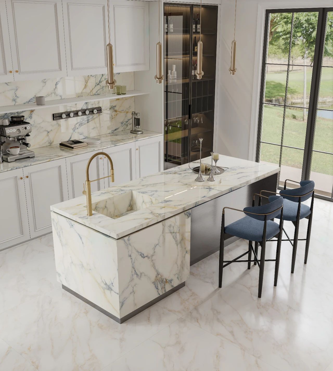 烹飪美食的魔法空間,光感需求更要充分考慮,以迪奧金營造簡約視覺效果,淺色系島臺,獨特的奢石紋理與連紋交錯,銜接自然舒適,空間藝術格調得以提升。
