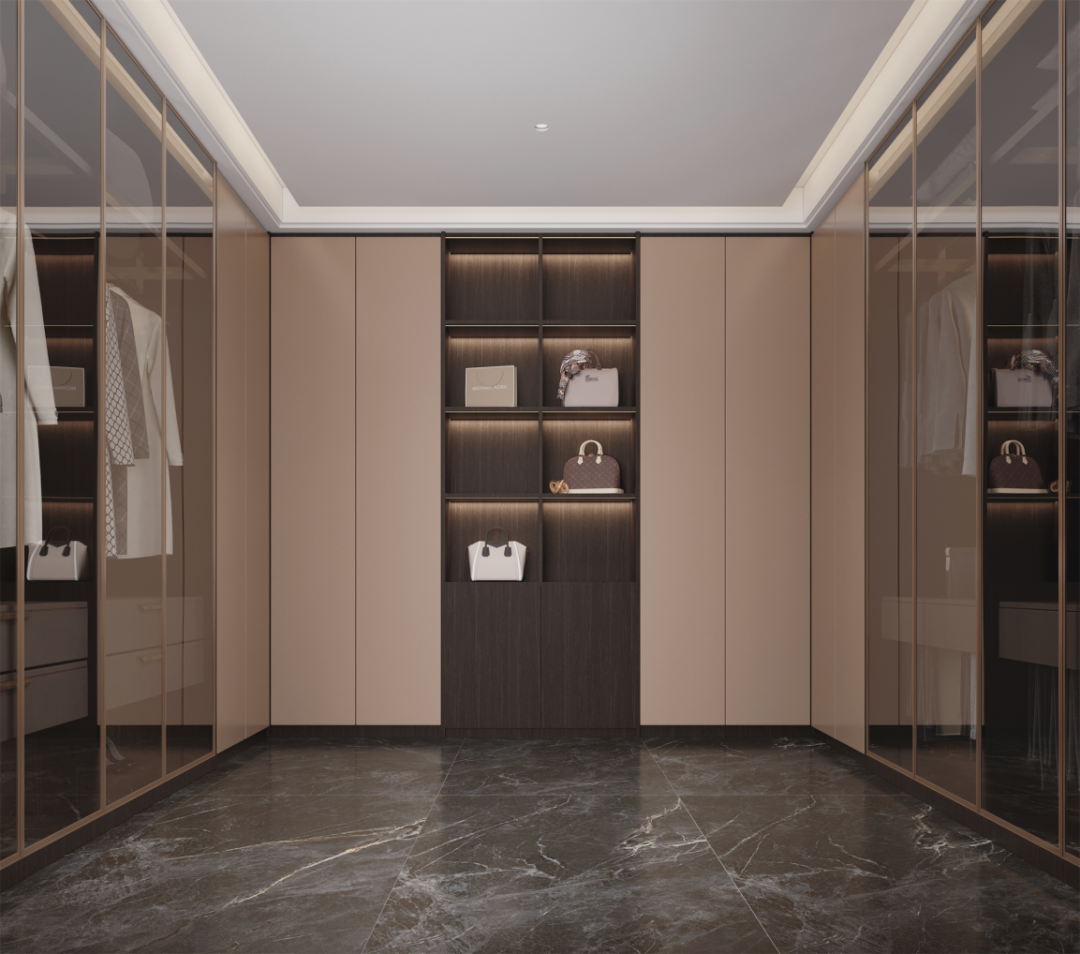承載著儲物、展示和化妝等多重功能的儲物間,空間內光線柔和均勻顯得尤為重要,墻地巖板采用超自然光感技術,呈現25°柔和光感,大規格尺寸,做到一板到頂,整體觀感舒適,衣物呈現更顯高級,營造時尚且私人的個人空間。