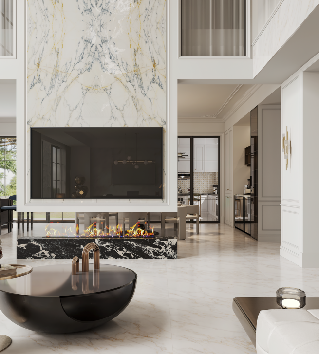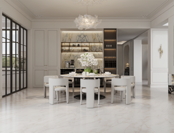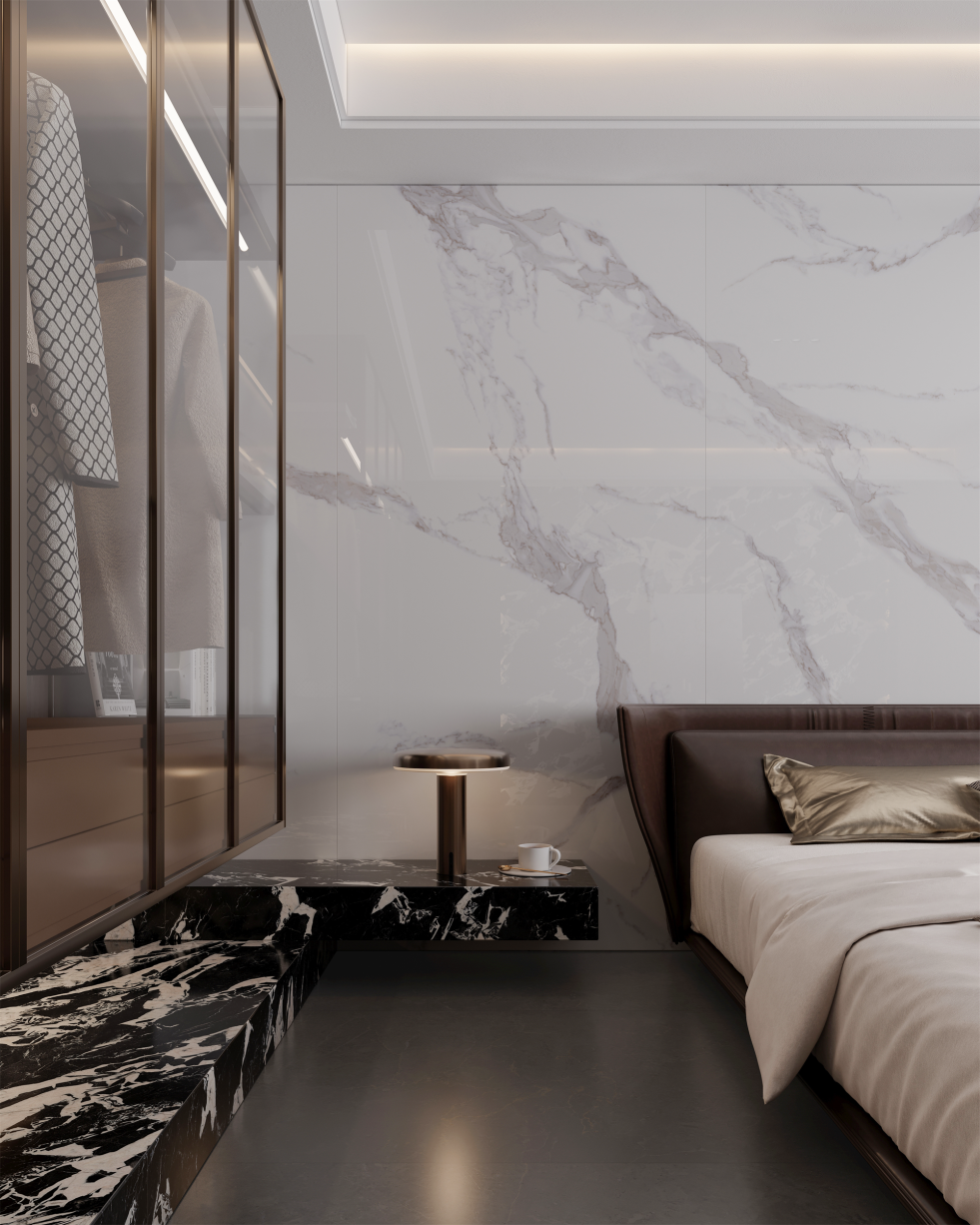 白色背景和深色紋理之間的對比使寶格麗白在視覺上更顯迷人,為空間增加深度和廣度,每一塊寶格麗白的紋理皆是獨一無二,增添珍稀性,更顯尊貴。