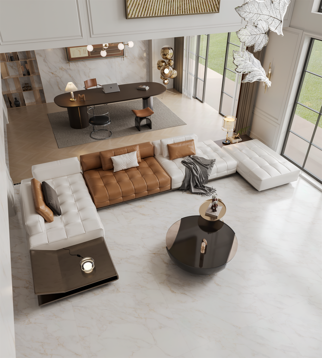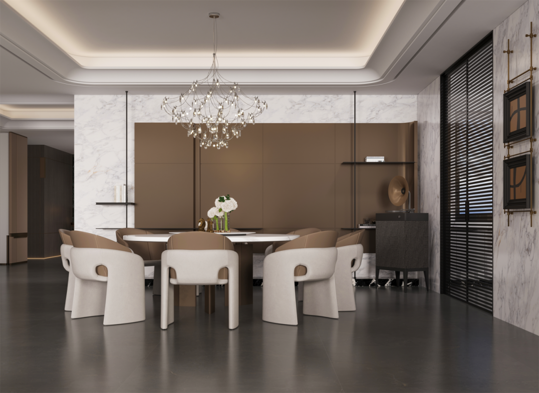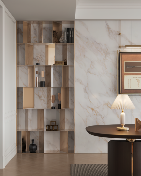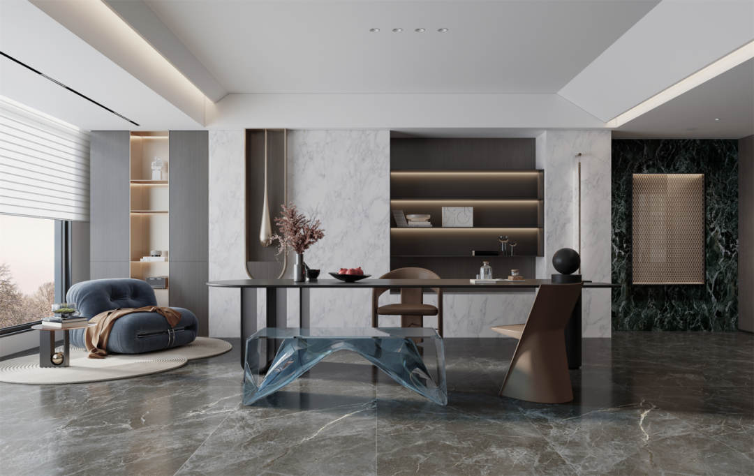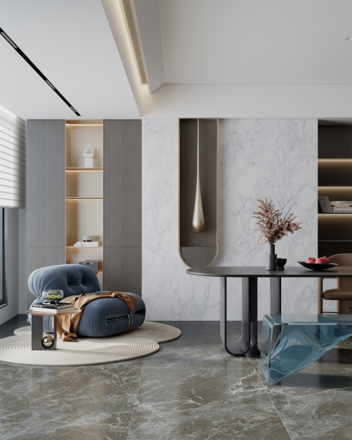 在客餐廳、書房及臥室搭配迪奧金,900*1800超大規格完美對縫密縫鋪貼,連紋4.0技術,視覺上實現空間自然融合與無限延伸,流暢而統一,營造出一種既開闊又溫馨的居住氛圍。