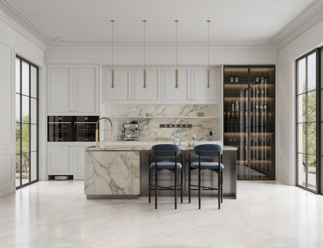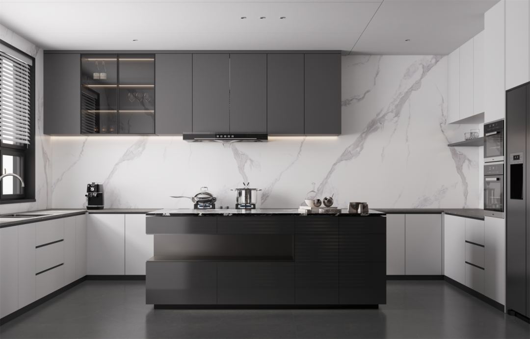 雪花白應用于餐廚空間,獨特紋理增添雅致氣息,每一塊巖板無縫銜接,整體更顯開闊和諧,體現現代工藝的精湛與細致,展現居住者對于細節與品質的極致追求。