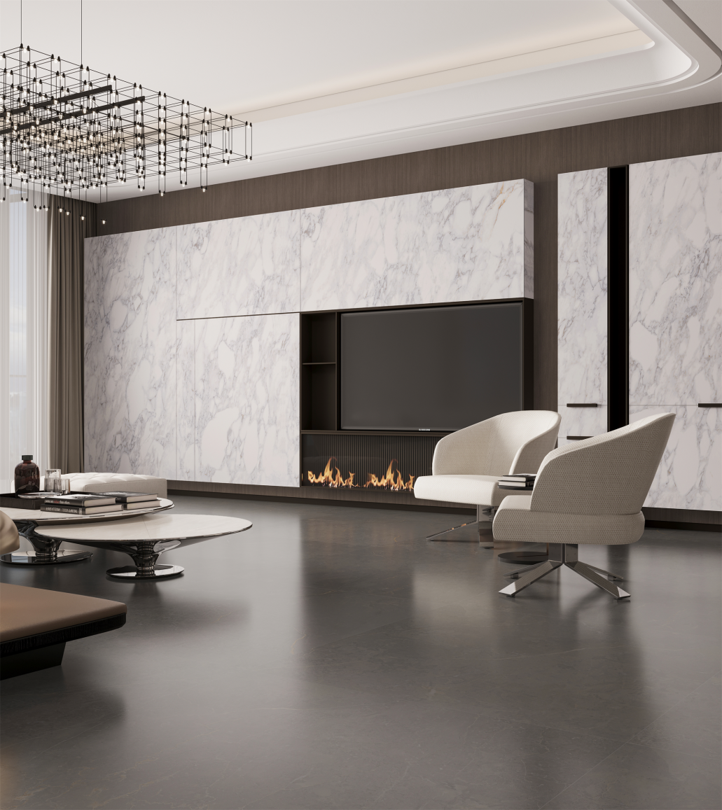 東鵬尊石2.0系列以自然石材為靈感源泉,精選世界珍稀石材為設計藍本,通過超感蝕刻工藝與自然光感技術加持,自然逼真地再現石材天然質感,以超白坯體,提升色彩表現,打造既尊貴又不失溫馨的藝術居住空間。