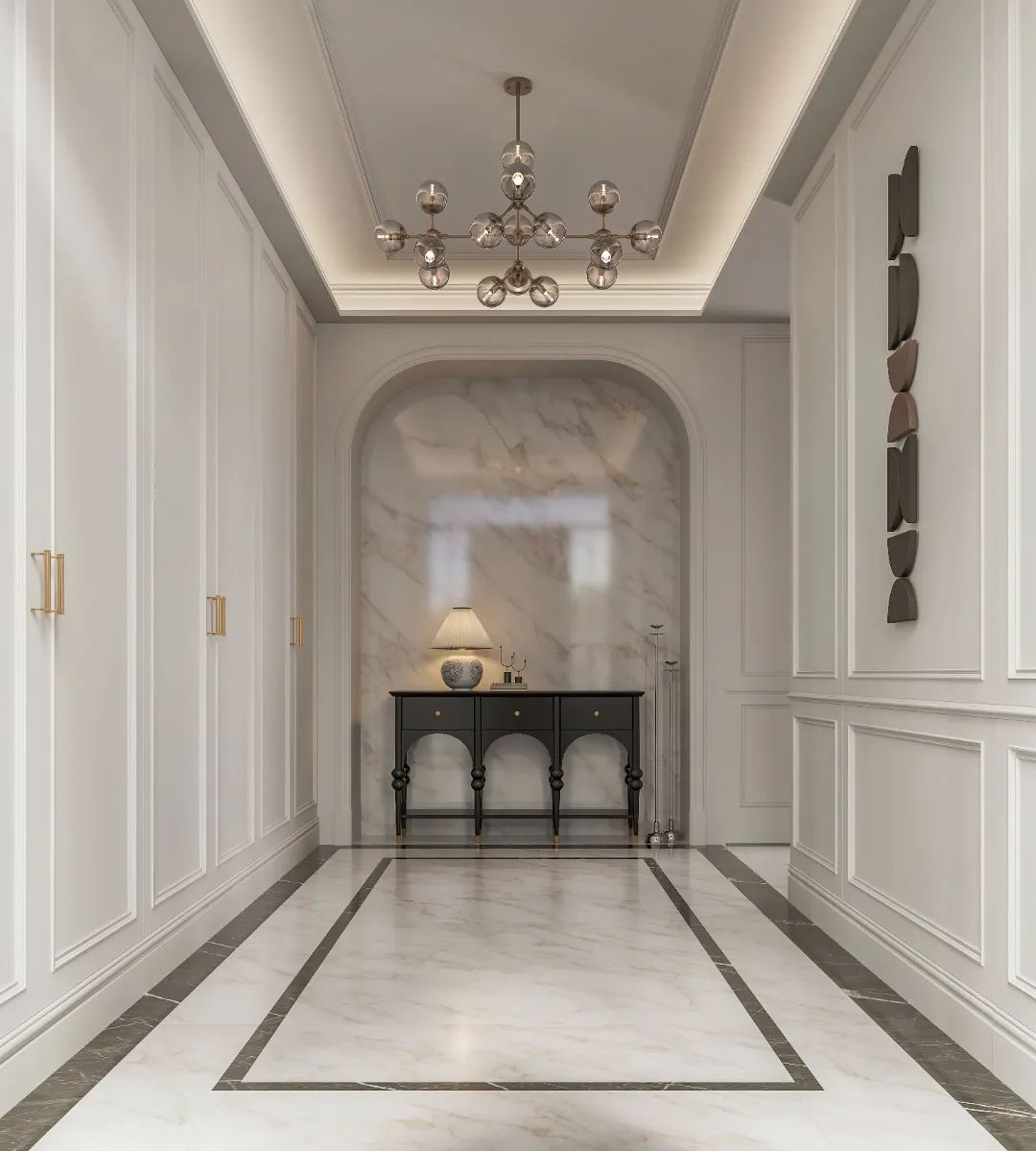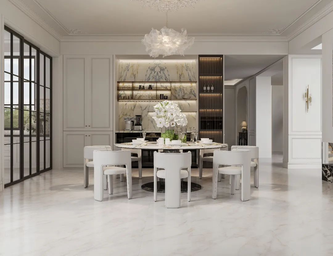 門廳作為入戶界面,是家的序章,也是讓居者切換狀態(tài)的過渡空間。墻地密縫鋪貼典雅的迪奧金,讓歸家伊始,高貴優(yōu)雅迎面而至。絲滑柔光的釉面為空間自然提亮,奢石原生質(zhì)感與曲直分明的線條脈絡(luò)交織,呈現(xiàn)優(yōu)雅精致的法式格調(diào),給予居者精致的歸家儀式感,回歸生活的舒雅。