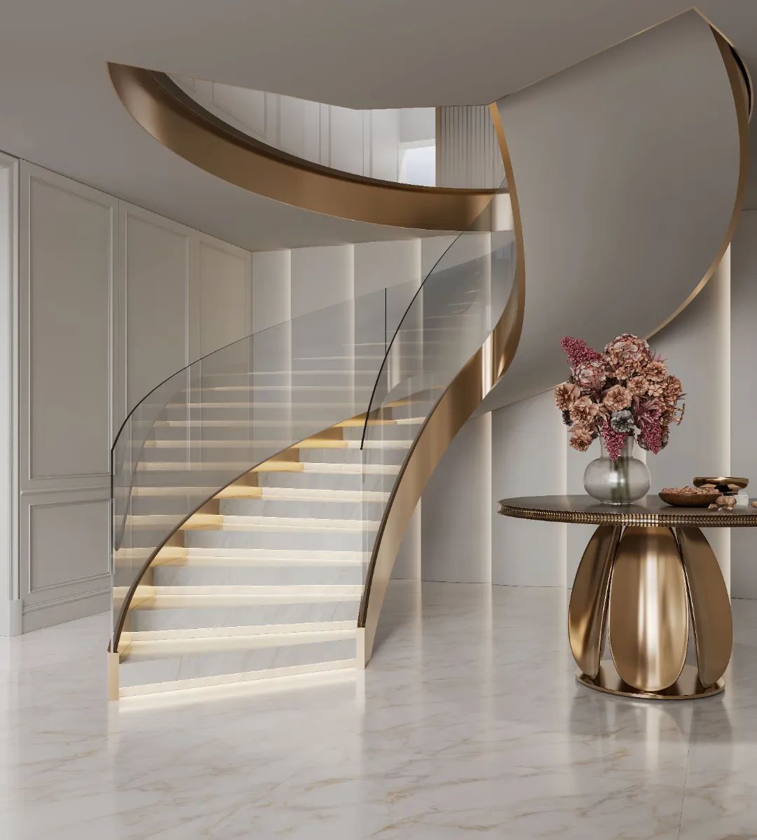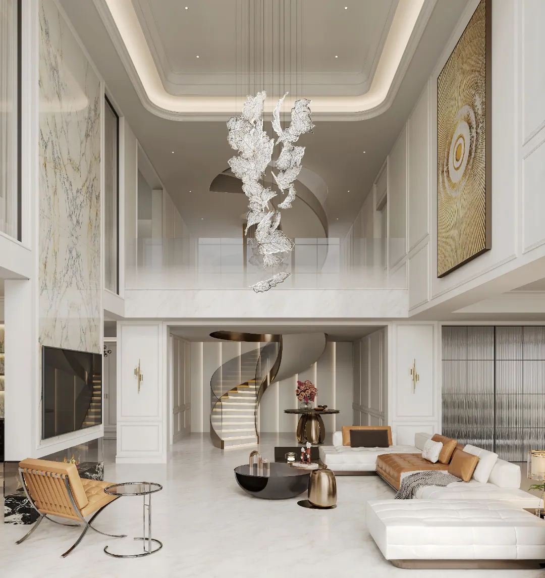 貫穿縱向空間的樓梯,將空間儀式感以藝術(shù)手法呈現(xiàn)。奢闊空間中,密縫鋪貼的迪奧金繪就優(yōu)雅一面,銀白與鎏金相間的法式旋轉(zhuǎn)樓梯如同一道藝術(shù)裝置,散發(fā)獨(dú)特魅力。云玉灰作為步階,25°自然光感讓盤旋而上的幾何美景更顯靈動(dòng)雅致。拾級(jí)而上,生活的藝術(shù)感在漸次放映。