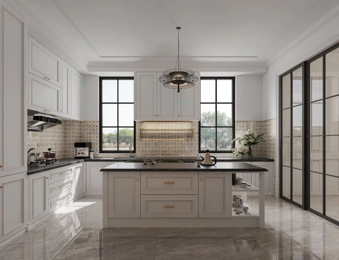 相比中廚,開放式西廚承載就餐、酒會(huì)等多元化社交功能。在通透明亮的開放空間中,迪奧金的無限連紋進(jìn)一步放大空間延伸感。墻面、島臺(tái)以奢雅的芬迪藍(lán)綴飾,靈動(dòng)的組合連紋流露著精致考究,消解空間的單調(diào)。島臺(tái)合理擴(kuò)展操作與儲(chǔ)物空間,成為親友聚會(huì)、烹飪小酌的絕妙場(chǎng)域,以浪漫情調(diào),調(diào)和生活的乏味。