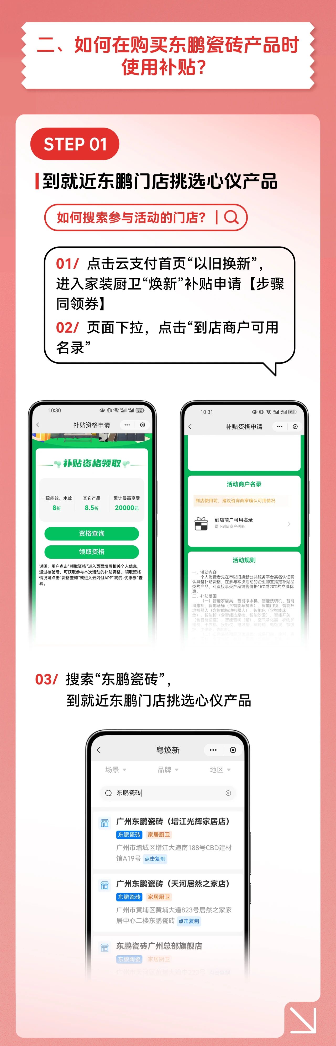 廣佛區域內,東鵬作為瓷磚品類首批享受政府補貼的品牌,攜手住建局及銀聯商務,成功舉辦家裝廚衛煥新啟動會。隨后,廣佛東鵬舉辦的以舊換新家裝廚衛煥新活動吸引超200人參與。