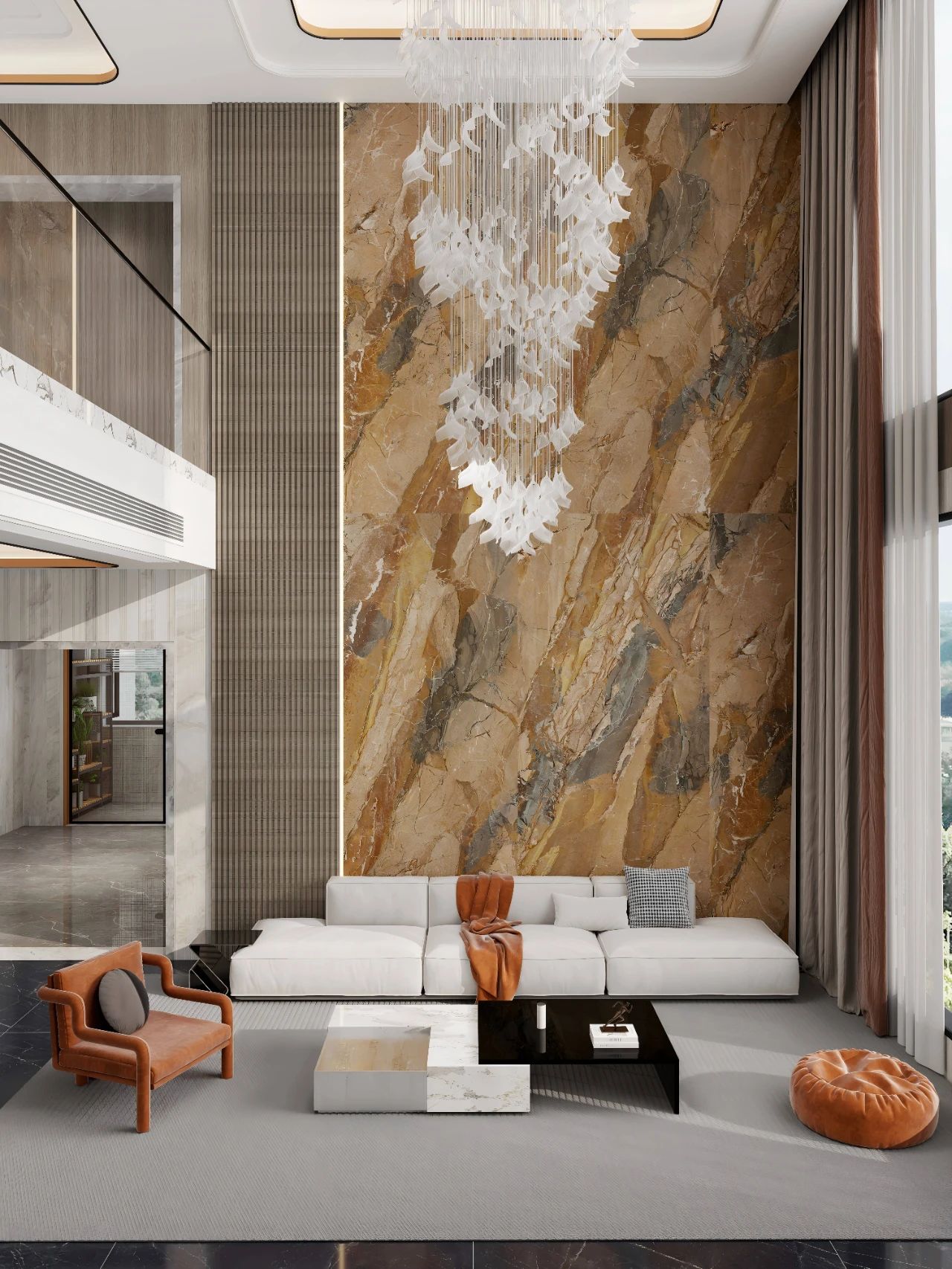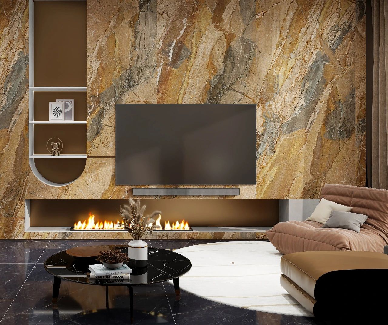 在色彩搭配上,歲月鎏金系列選用了啞光紅棕色調,這一色彩不僅凸顯了產品的奢華質感,更營造出一種溫馨而高雅的居家氛圍。從背景墻的裝飾到地板的鋪設,再到奢侈品牌家具的點綴,該產品的應用范圍廣泛,能夠滿足不同場景、不同風格的設計需求。