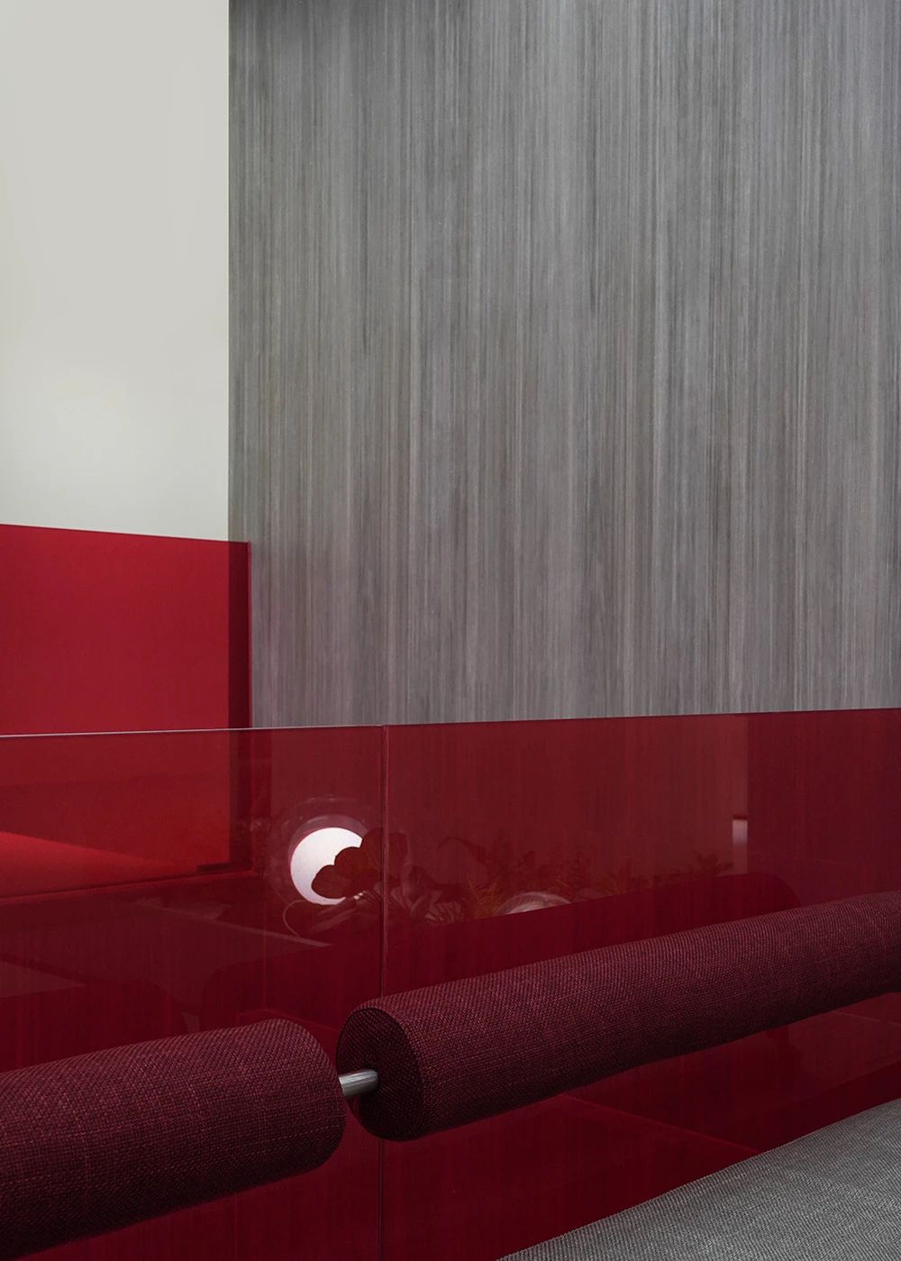 老舍曾說:“生活是一種律動,須有光有影,有左有右,有晴有雨,趣味就在這變而不猛的曲折里,微微暗些,再明起來,則暗得有趣,而明乃更明。”紅色玻璃自一樓蜿蜒至二樓,環繞中空,宛若飄逸絲帶,涌動不息。東方器物美學,促成東方的風雅。設計師將該文化因素融入空間,鑄就了其深厚的文化底蘊,于空間中詩意地鋪陳開來。同時,將西方的現代藝術與東方雅致意境相聯結,在西方的“奢”與東方的“雅”之間達成微妙的平衡。木質的溫潤與自然的韻味,與光影交錯、肌理相融,于簡約修飾間流露出細膩質感。瞬間,重負得以釋放,身心輕盈,渲染慵懶愜意的就寢氛圍。