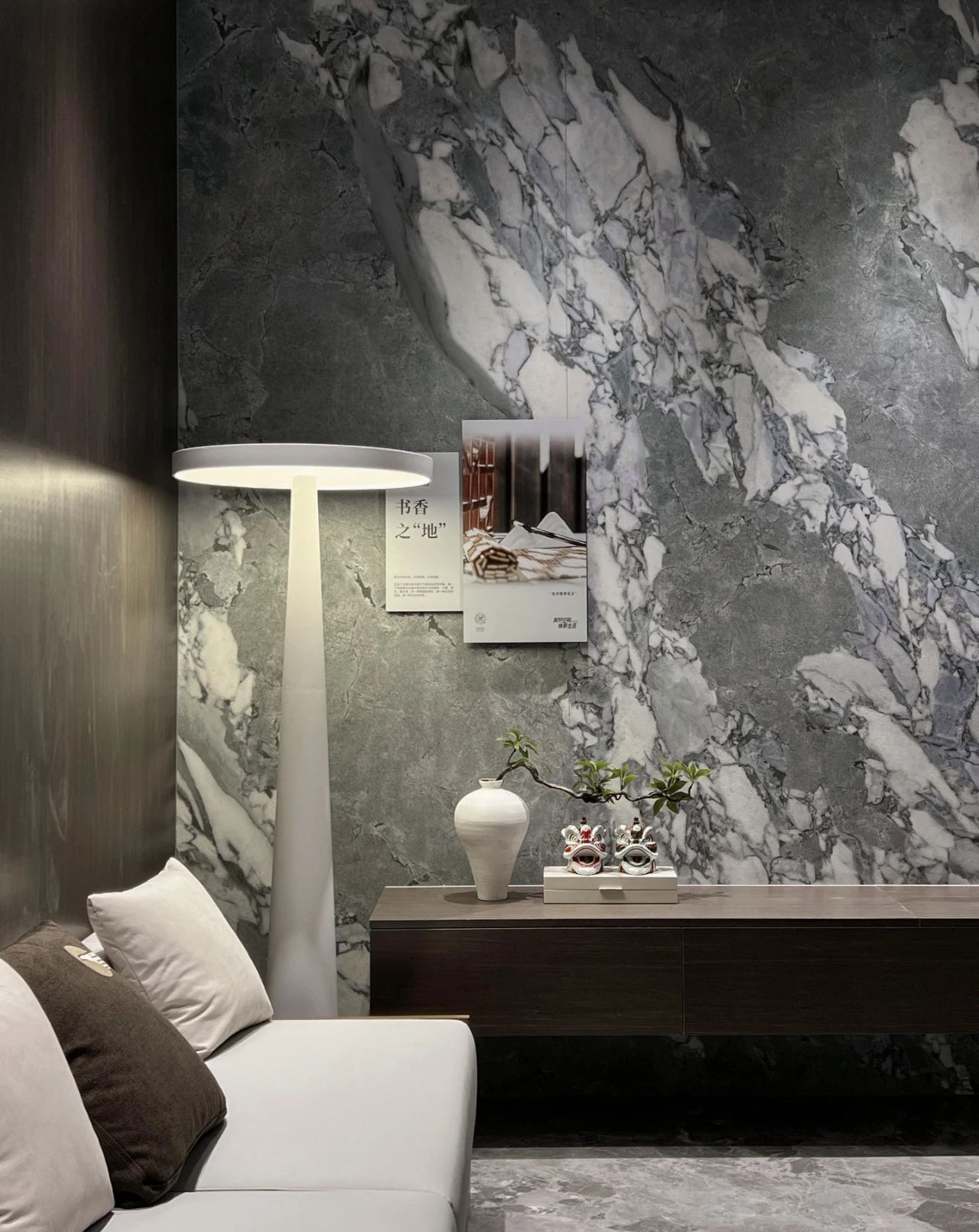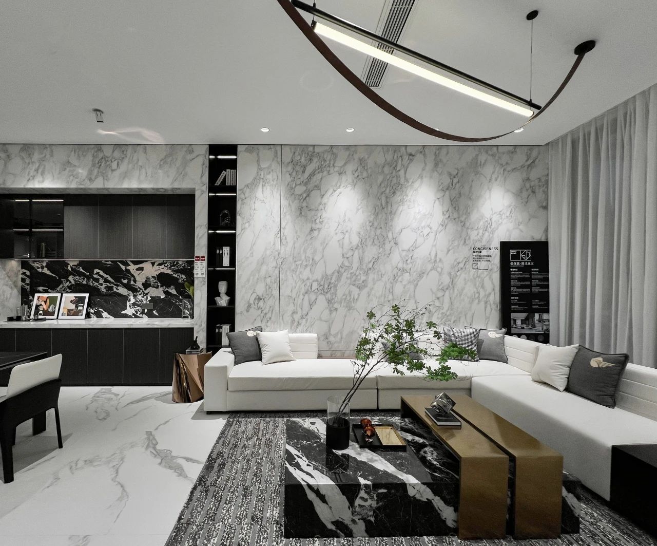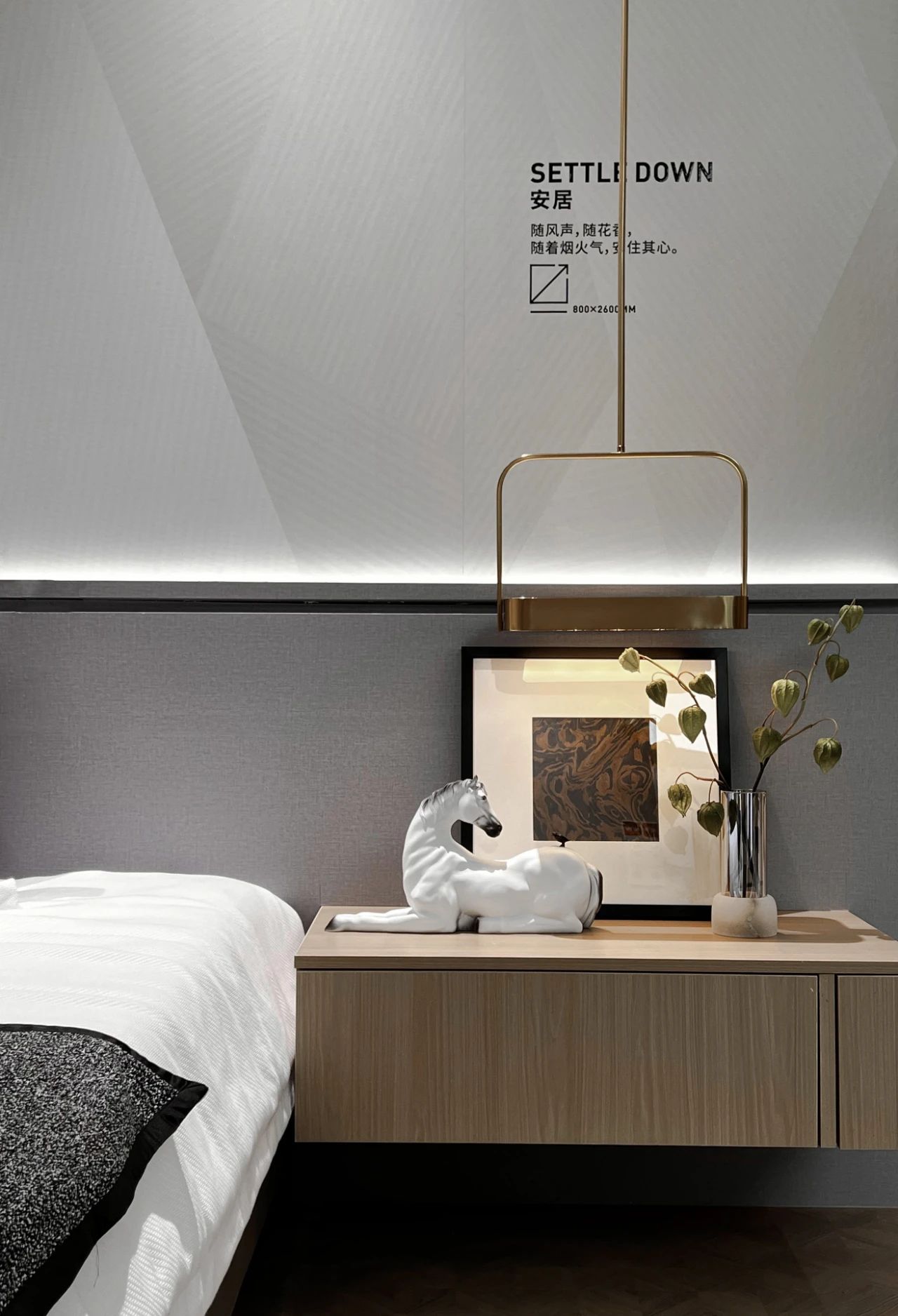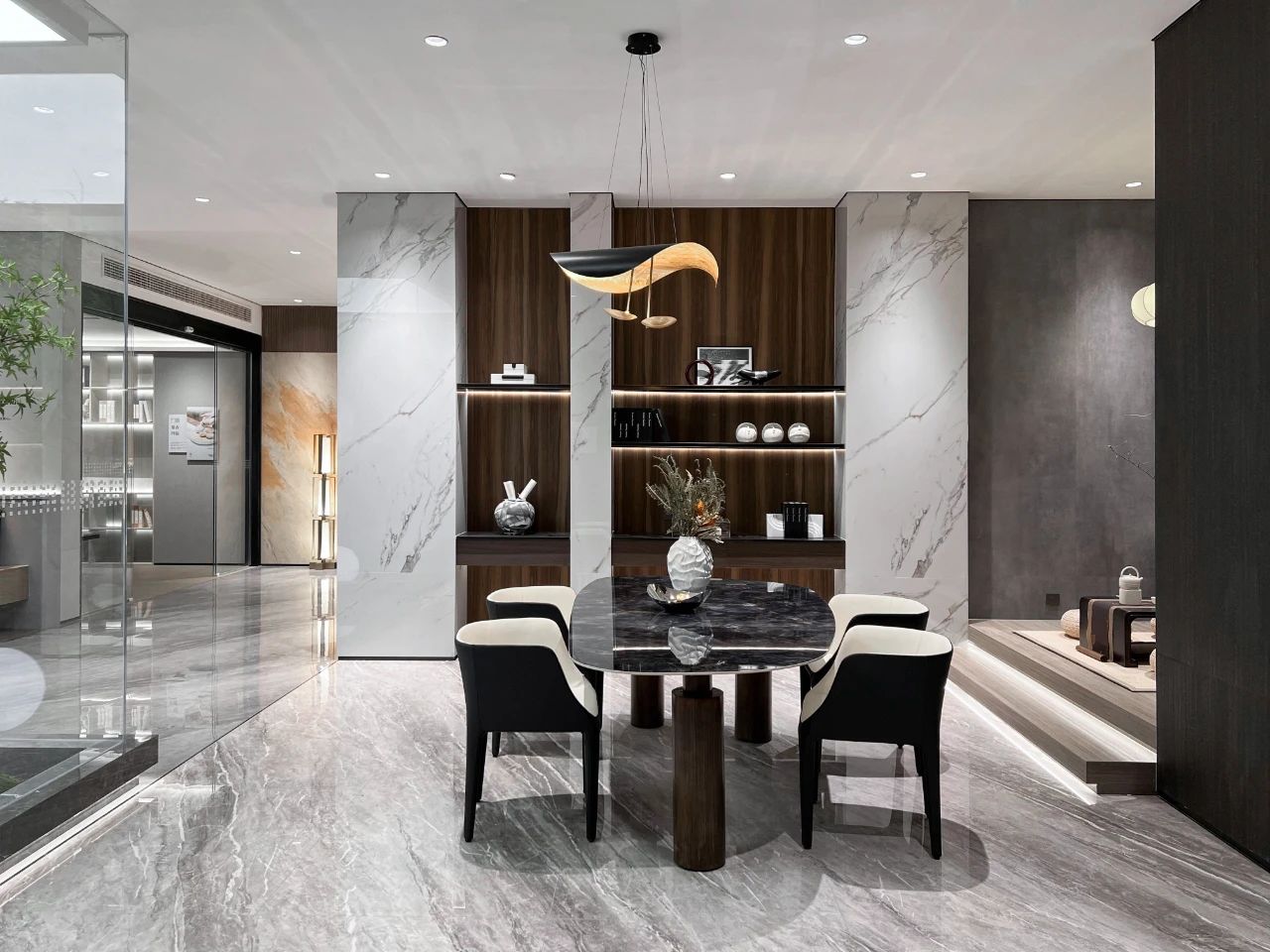項目地址 | 江蘇省連云港市海州區興隆裝飾城建材3號館連云港,黃海之濱的璀璨明珠,山海相依,云霧繚繞,訴說著千古風華。踏入店內,克制而精妙的設計巧思,賦予空間以純凈無瑕的美感。經由設計師之手,整個空間呈現出一種清朗而雅致的干凈氛圍。觀設計巧妙融合室內外空間,遵循自然法則,巧妙利用光影與建筑的互動,為空間注入靈動的生命力,石材、植被等天然的材質巧妙運用,渲染出空間自然美感而形成的獨特氣韻,素雅且閑靜、舒緩而柔和。在中國文化中,家是心靈的港灣,承載著放松與休憩的溫馨。木質家居增添濃郁暖意,柔和燈光烘托出家的溫馨氛圍,使中式設計的家具更顯典雅獨特。水吧設計采用沉穩色調,巧妙融合木紋與小牛皮,觸目所及皆為品質巖板,全方位打造巖質家居風情。黑白色調為主的客餐廚設計,通過穿插、疊加、碰撞,勾畫物體之間的比例關系,展現空間別樣生命力。將輕松舒適融入居家,盡享純粹生活之樂。當代青年對愜意棲居有著獨到追求:向往自由不羈的生活方式,秉持隨性自在的態度,并以簡約有力的語言展現。采用柔和且中性的材質與色調,著重強化空間的場域氛圍,讓產品和諧融入,共同營造出一個整體氣氛融洽的居家環境。空間與時間相互交織,各種材料以其獨特的感性物質參與了一場流暢婉轉的協奏。