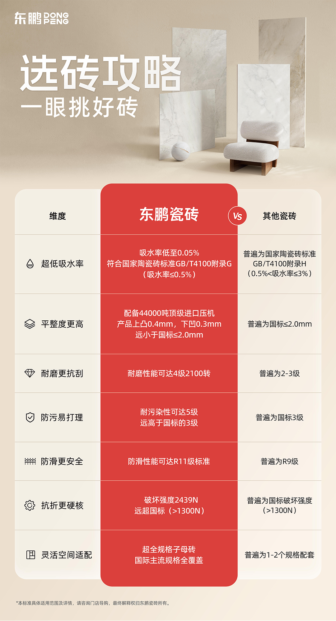 東鵬瓷磚的卓越性能早已將“好房子”標(biāo)準(zhǔn)落到產(chǎn)品實(shí)處。在瓷磚選擇的七大衡量維度中,東鵬產(chǎn)品的吸水率低至0.05%(遠(yuǎn)優(yōu)于國(guó)家陶瓷磚標(biāo)準(zhǔn)GB/T4100附錄G);平整度上凸0.4mm、下凹0.3mm(國(guó)標(biāo)為≤2.0mm);耐磨性能達(dá)4級(jí),可經(jīng)受4級(jí)2100轉(zhuǎn)的壓力考驗(yàn);耐污染性達(dá)5級(jí),高于國(guó)標(biāo)的3級(jí);防滑性能達(dá)R11級(jí),優(yōu)于市面常見(jiàn)的R9級(jí);抗折強(qiáng)度高達(dá)2439N(國(guó)標(biāo)為>1300N)。