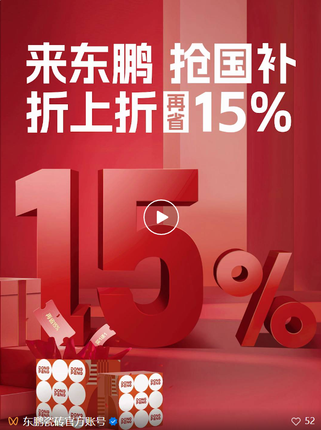 另外,國(guó)補(bǔ)利好的政策落實(shí)也在線上如火如荼地展開(kāi)。東鵬作為天貓喵住平臺(tái)指定瓷磚國(guó)補(bǔ)品牌,打通了品牌線上線下國(guó)補(bǔ)覆蓋鏈路,全面滿足消費(fèi)者的多樣化需求,通過(guò)提供高品質(zhì)產(chǎn)品與貼心服務(wù)獲得消費(fèi)者持續(xù)信賴。