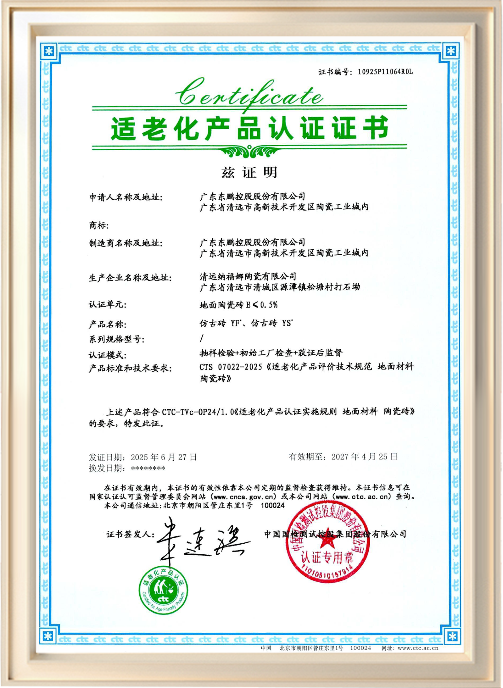 本次認證由具有央企背景的CTC國檢集團權威執(zhí)行。作為A股首家“中國”字頭檢驗認證上市公司,該機構嚴格依據CTS 07022-2025《適老化產品評價技術規(guī)范 地面材料陶瓷磚》標準,對東鵬凈奢石系列兩款產品展開全面檢測。檢測不僅覆蓋老年群體最核心的地面安全痛點——通過濕態(tài)擺式阻滑值測試防滑性能、通過光澤度控制實現防眩光效果,更在耐磨性、放射性、耐污染性等綜合指標上均達到適老建材高標準要求,為長者居家安全構筑全方位保障。