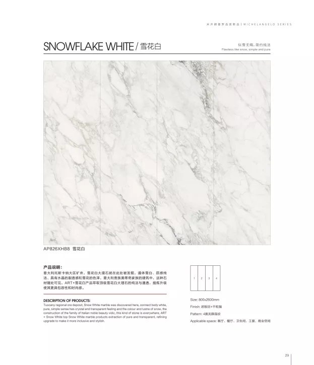 產(chǎn)品故事:意大利托斯卡納大區(qū)礦床,雪花白大理石就在此處被發(fā)掘,通體雪白、質(zhì)感純潔、具有水晶的剔透感和雪花的色澤,意大利貴族美蒂奇家族的建筑中,這種石材隨處可見,ART+雪花白產(chǎn)品萃取頂級(jí)雪花白大理石的純潔與通透,提煉升級(jí)使其更具包容性和時(shí)尚感