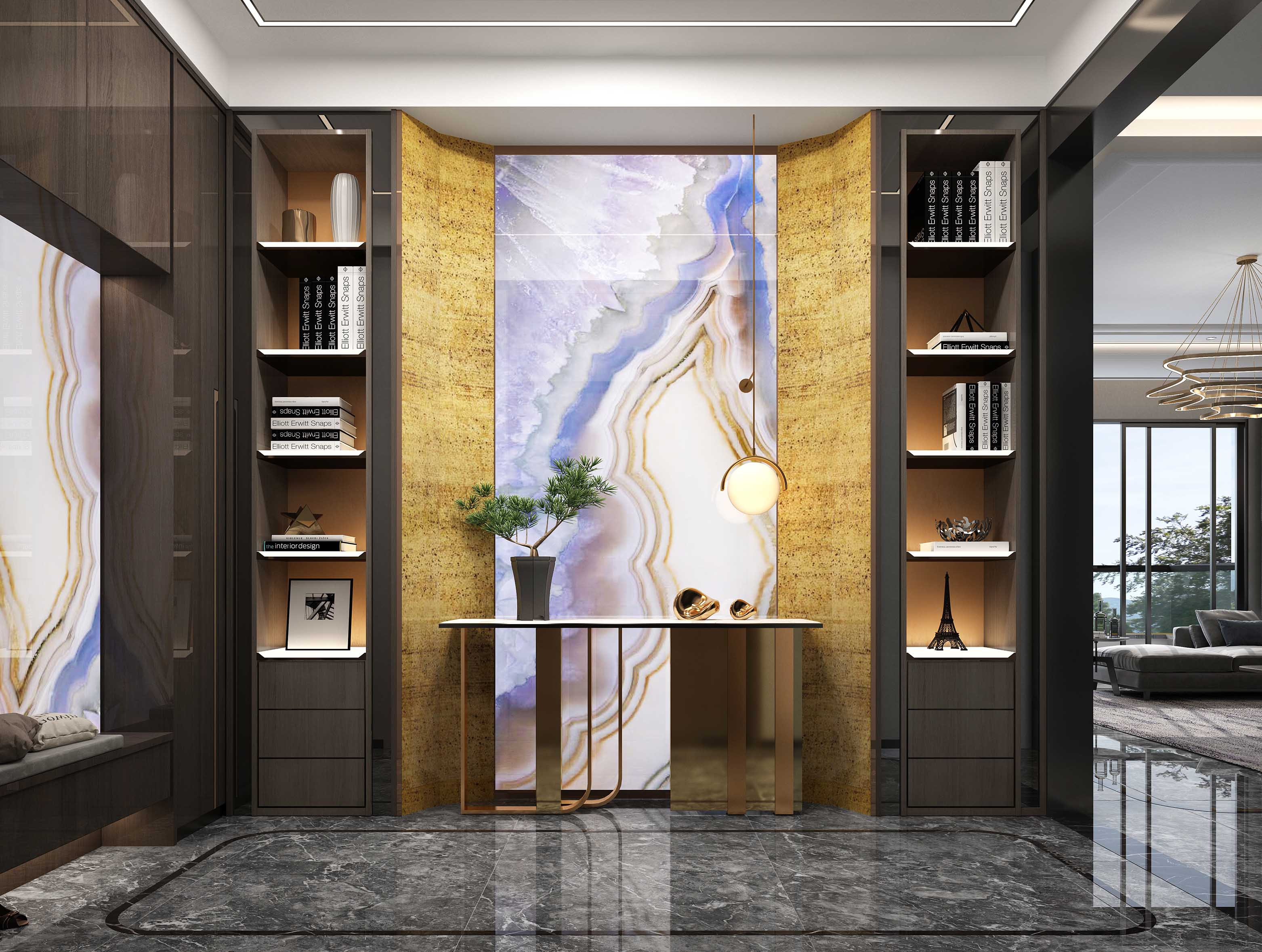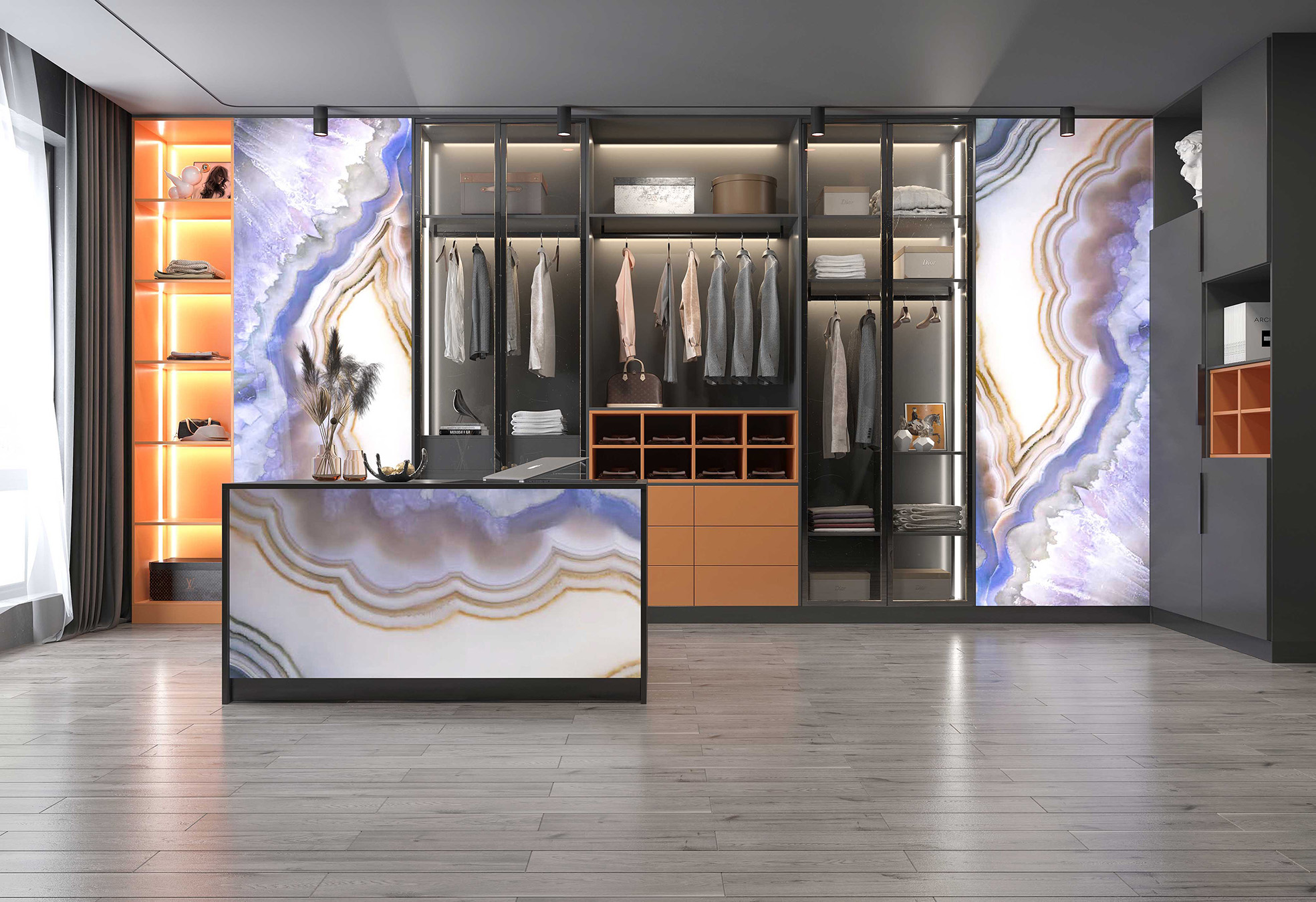 作為一款聚合物薄膜或紡織布料為夾層材料的創新新型板材,厚度可以根據要求而定制。產品本身同時帶有防沾污琉璃表面易于維護和清潔,適用于墻壁、地面、廚房、浴室、門、家具飾面,常規尺寸1200X2800MM。